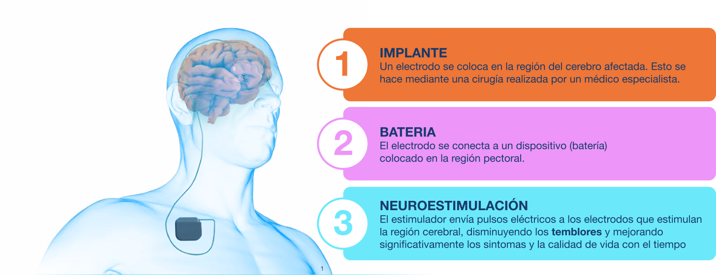 El tratamiento utiliza la tecnología de un dispositivo (bateria) implantado bajo la piel, conectado a electrodos que estimulan la región del cerebro afectada por el Parkinson, mejorando los síntomas.³